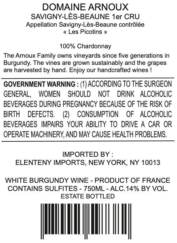 A 100% Chardonnay white Burgundy wine from Domaine Arnoux's premier cru vineyard in Savigny-lès-Beaune, France. Handcrafted from sustainably grown grapes harvested by hand, estate bottled at 14% ABV.