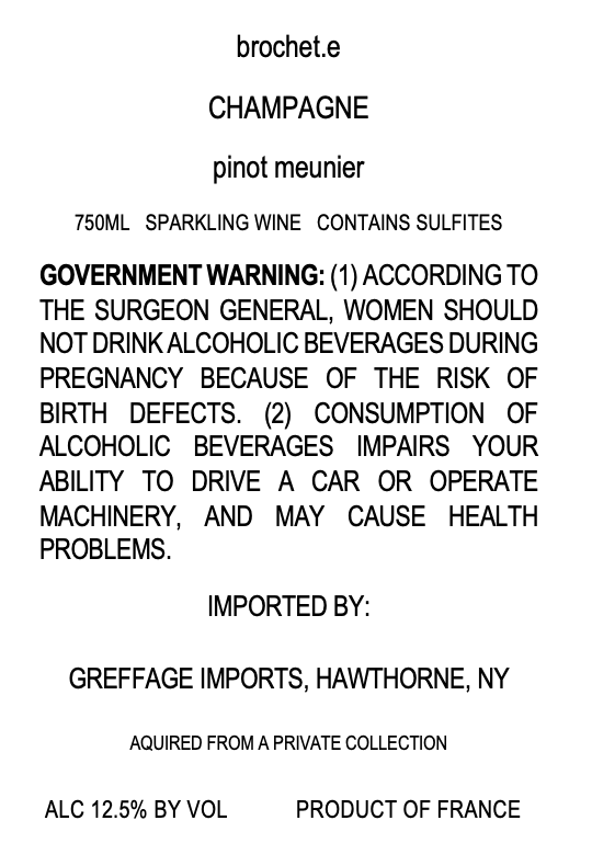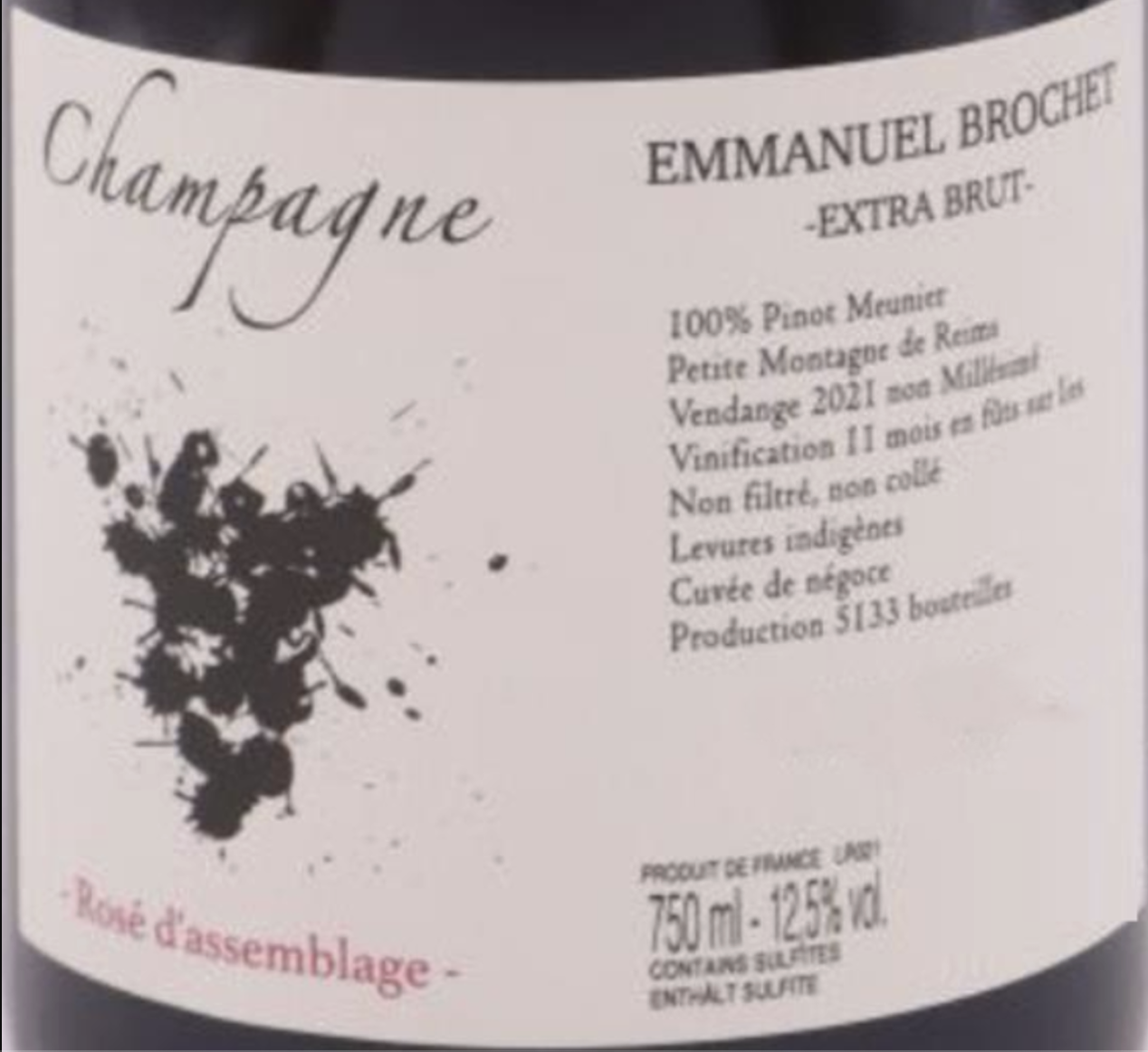 Emmanuel Brochet Extra Brut Champagne made from 100% Pinot Meunier grapes from Petite Montagne de Reims, vintage 2021. Unfiltered and unfined with indigenous yeasts.