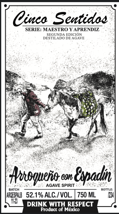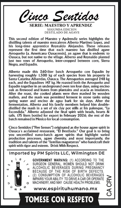 A nano-batch agave spirit blending Arroqueño and Espadín agaves, hand-crafted by maestro mezcalero Alberto Martinez Lopez and his apprentice Reynaldo Alejandro in Oaxaca, Mexico. Double-distilled in clay pot stills using traditional production methods.