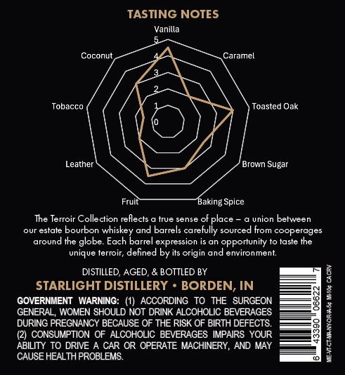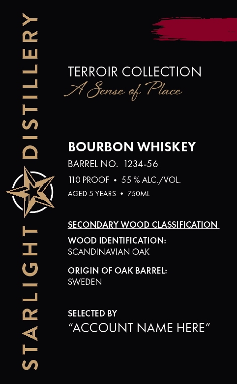 Starlight Distillery Terroir Collection Single Barrel Bourbon aged 5 years and finished in Scandinavian oak from Sweden, bottled at 110 proof (55% ABV).