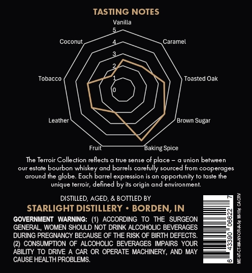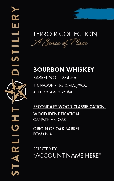 Starlight Distillery Terroir Collection Barrel No. 1234-56 is a single barrel bourbon aged 5 years and finished in Carpathian oak from Romania, bottled at 110 proof (55% ABV).