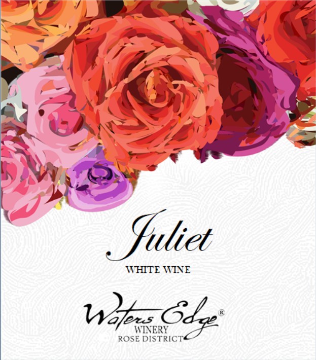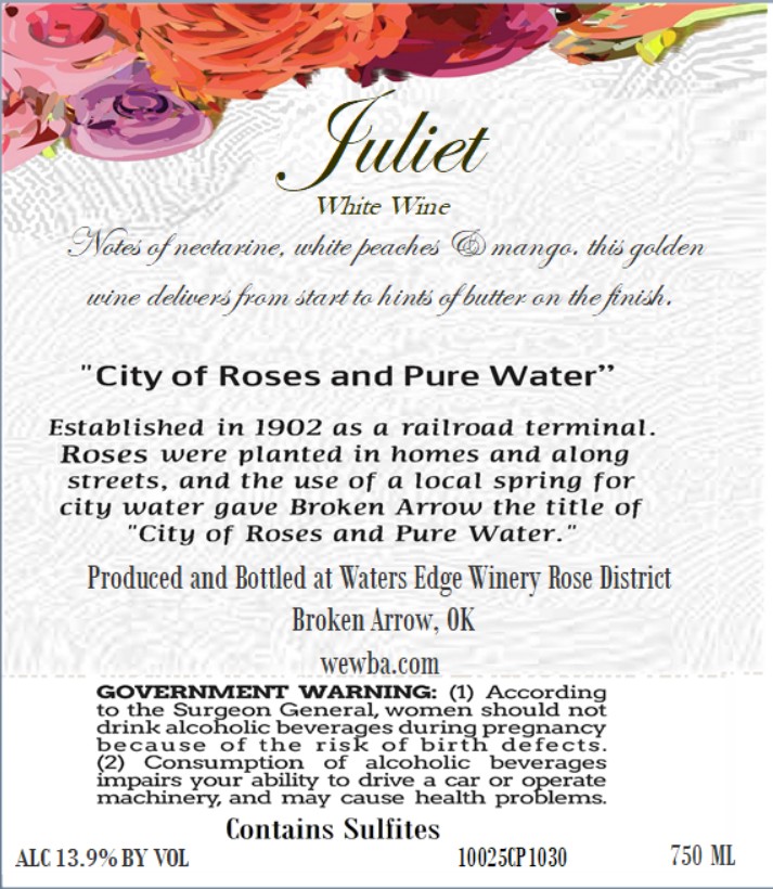 Juliet is a white wine from Waters Edge Winery Rose District in Broken Arrow, Oklahoma, featuring notes of nectarine, white peaches, and mango with hints of butter on the finish.