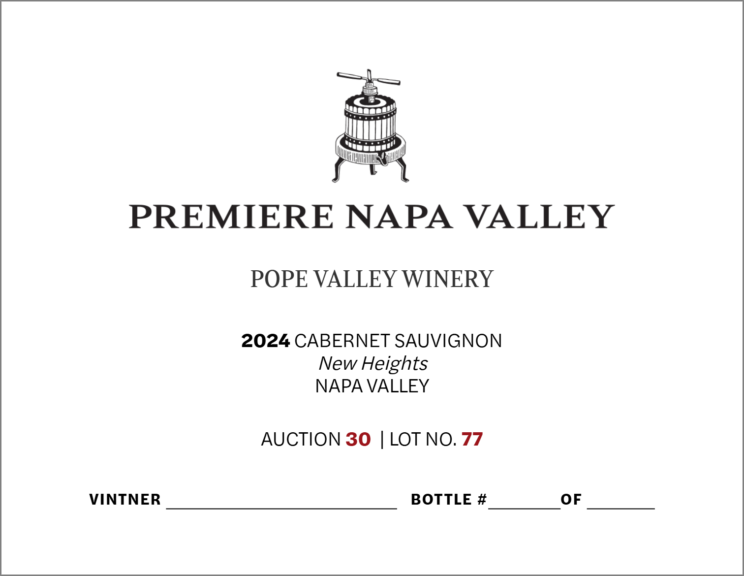 A limited-production Cabernet Sauvignon dessert wine from Pope Valley Winery, part of the Premiere Napa Valley auction series. Handcrafted with personal expression, produced in extremely limited quantities (60-240 bottles per vintage).