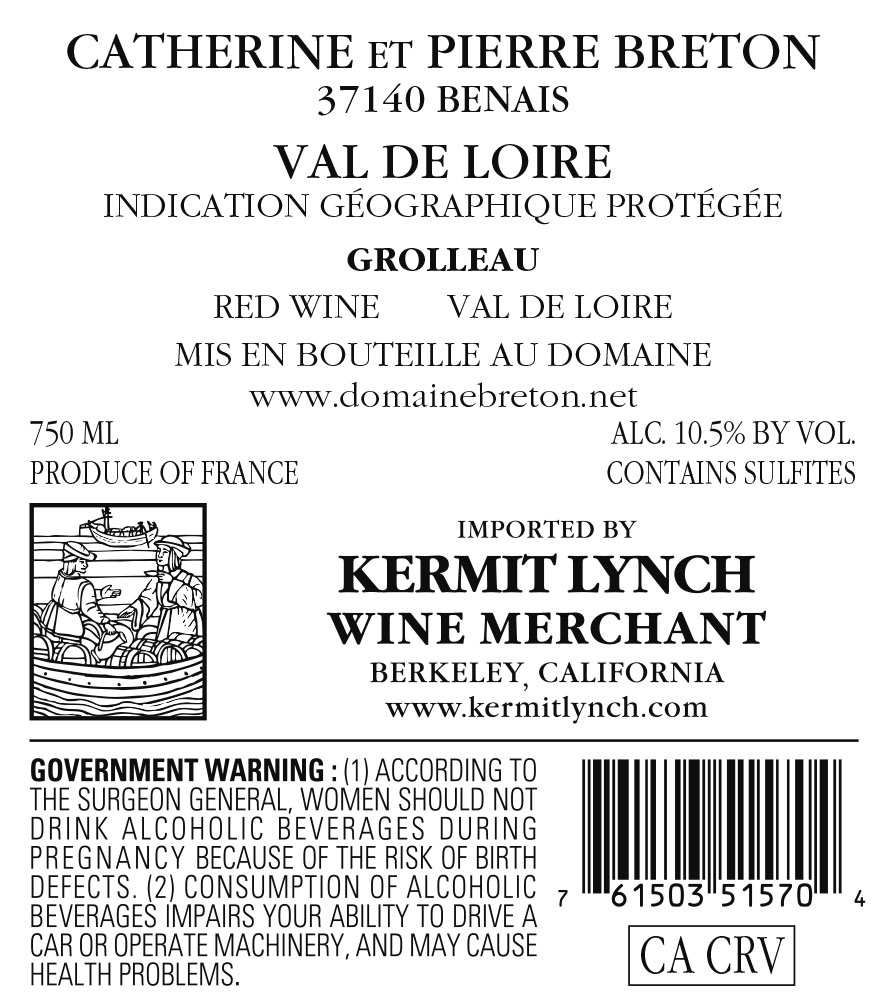 A French red wine from Val de Loire made from Grolleau grapes by Catherine et Pierre Breton, bottled at the domaine with 10.5% alcohol by volume.