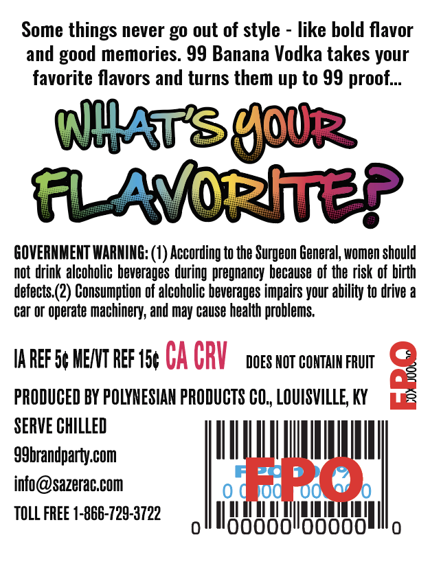 99 Banana Vodka is a banana-flavored vodka bottled at 99 proof (49.5% ABV) with natural flavors, produced by Buffalo Trace Distillery in Kentucky.