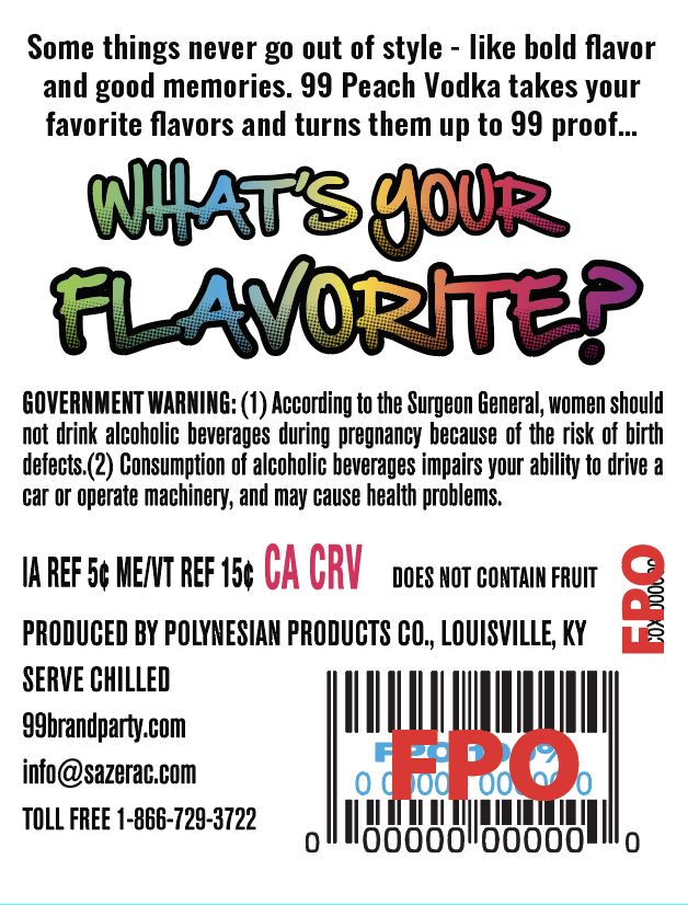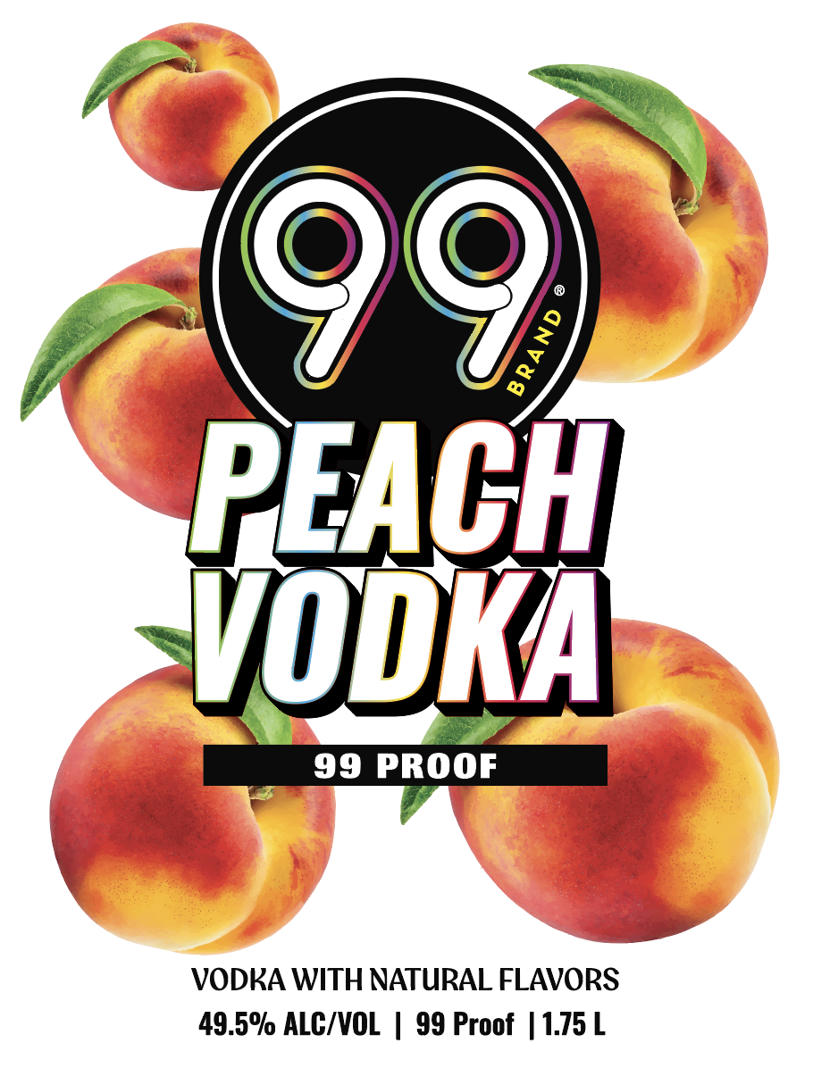 99 Peach Vodka is a peach-flavored vodka bottled at 99 proof (49.5% ABV) with natural flavors, produced by Buffalo Trace Distillery in Kentucky.