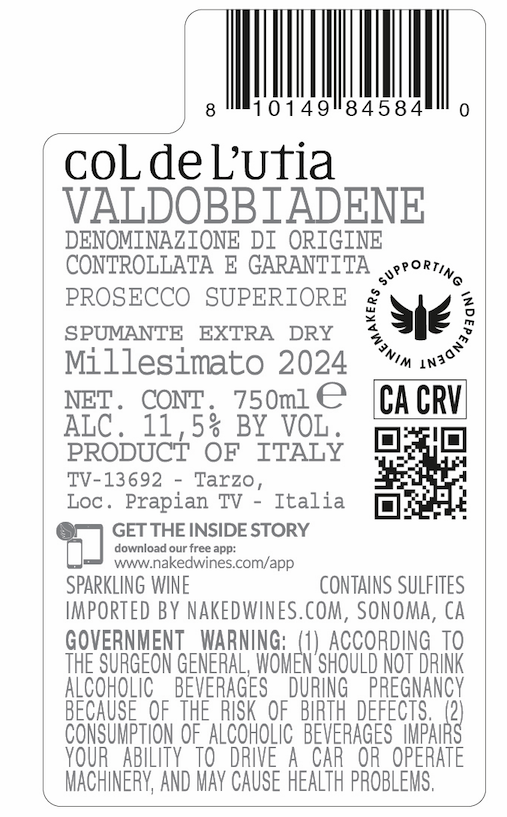 Col de L'utia Valdobbiadene Prosecco Superiore DOCG Spumante Extra Dry, a premium Italian sparkling wine from the Veneto region, bottled at 750ml with 11.5% ABV.