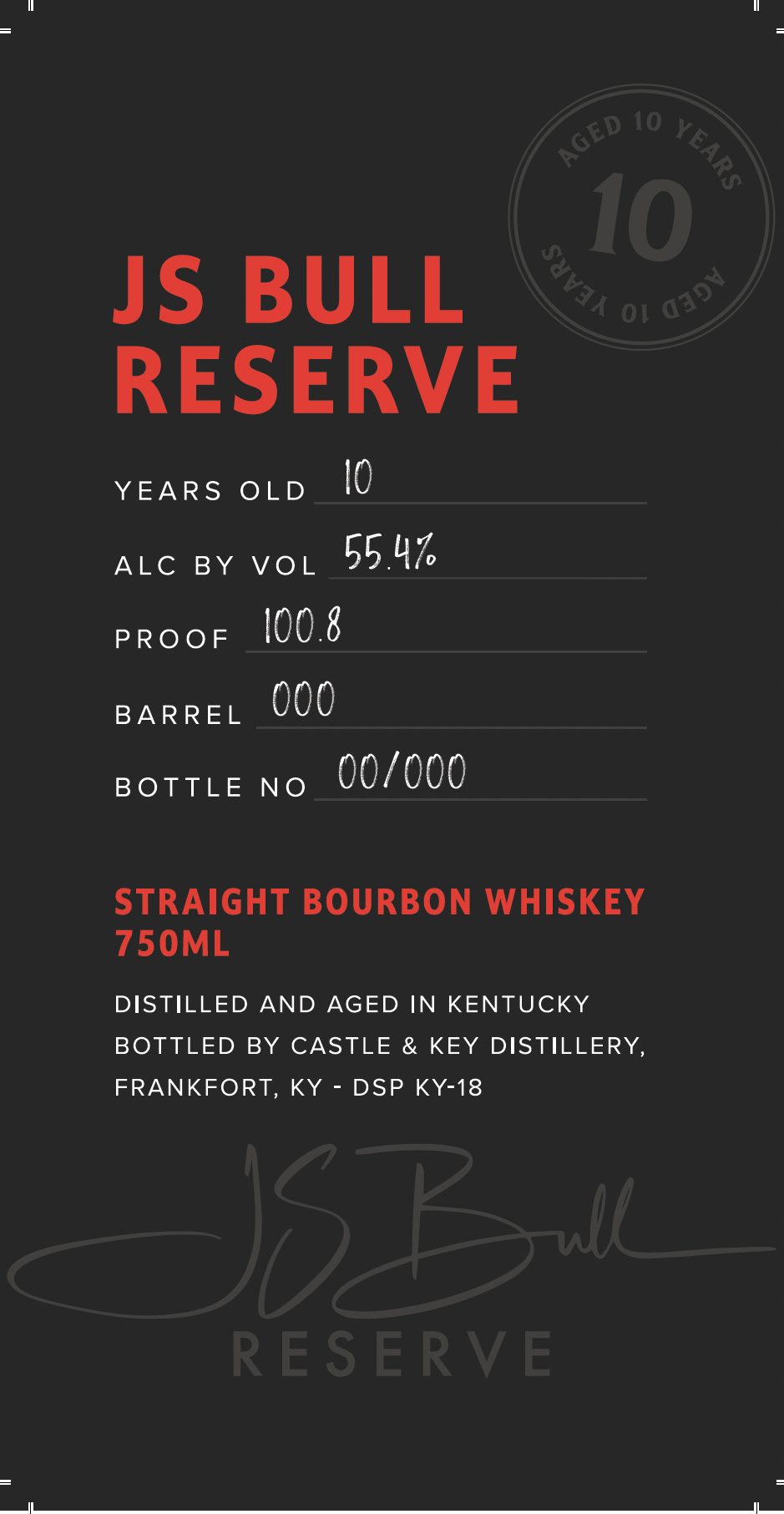 JS Bull Reserve is a 10-year-old straight bourbon whiskey distilled and aged in Kentucky, bottled at 100.8 proof by Castle & Key Distillery.