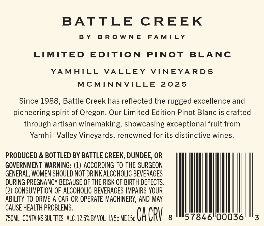 Battle Creek Limited Edition Pinot Blanc from Yamhill Valley Vineyards in McMinnville, Oregon, crafted through artisan winemaking showcasing exceptional fruit from the region.