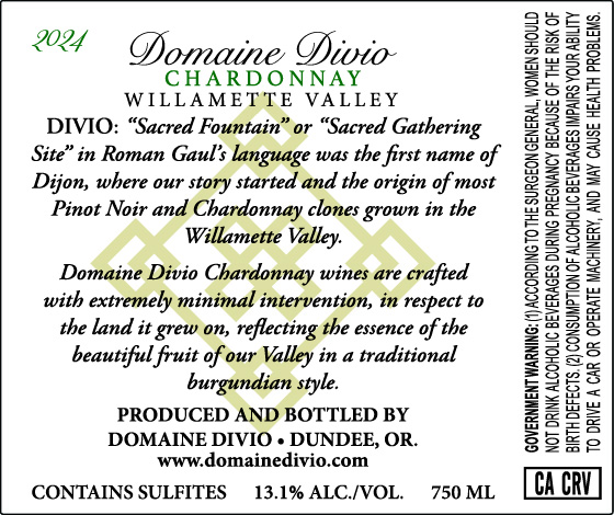 2024 Domaine Divio Chardonnay from Willamette Valley, Oregon, crafted with minimal intervention in a traditional Burgundian style. 13.1% ABV, 750 mL.