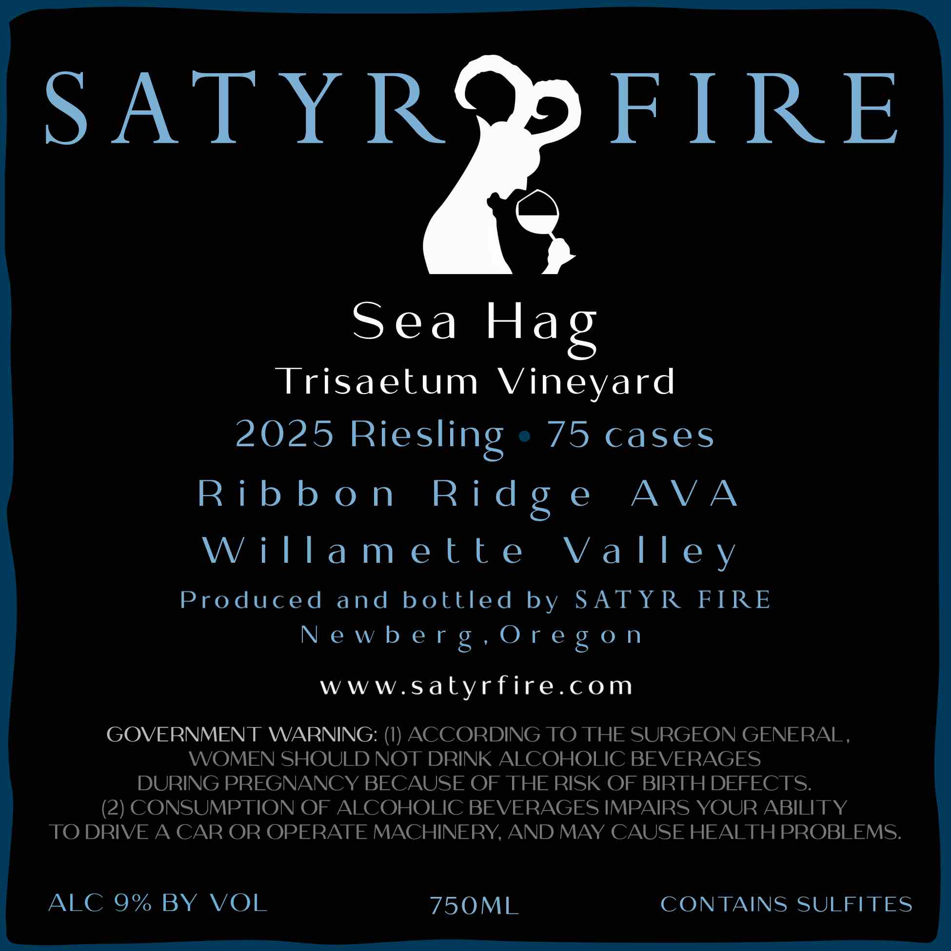 A 2025 vintage Riesling from Satyr Fire Vineyards in Oregon's Ribbon Ridge AVA, Willamette Valley. Produced and bottled at 9% ABV.