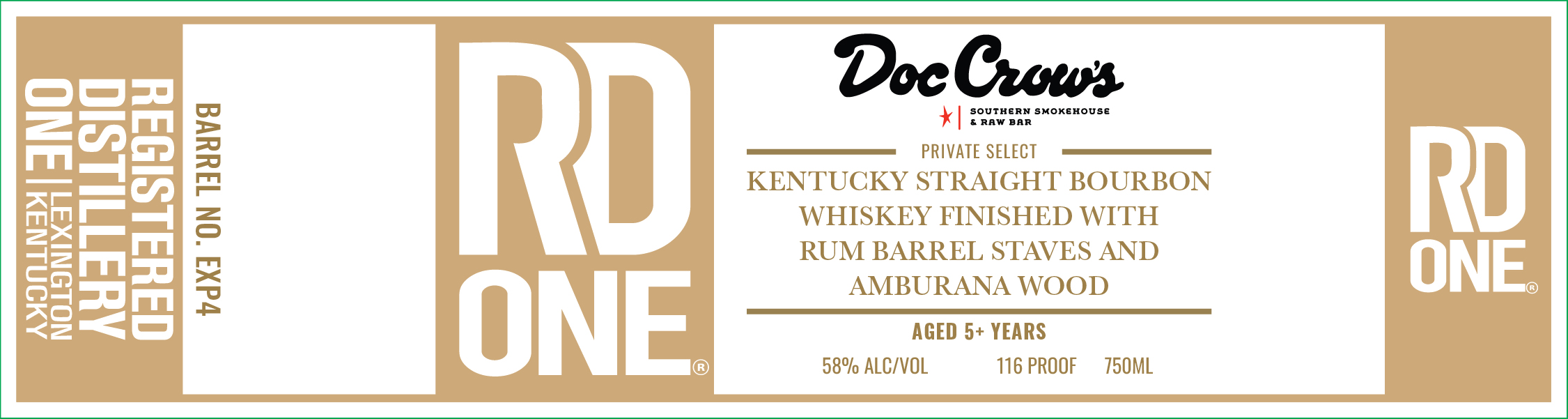 RD ONE Private Select is a Kentucky Straight Bourbon Whiskey finished with rum barrel staves and Amburana wood, bottled at cask strength from a single barrel selection.