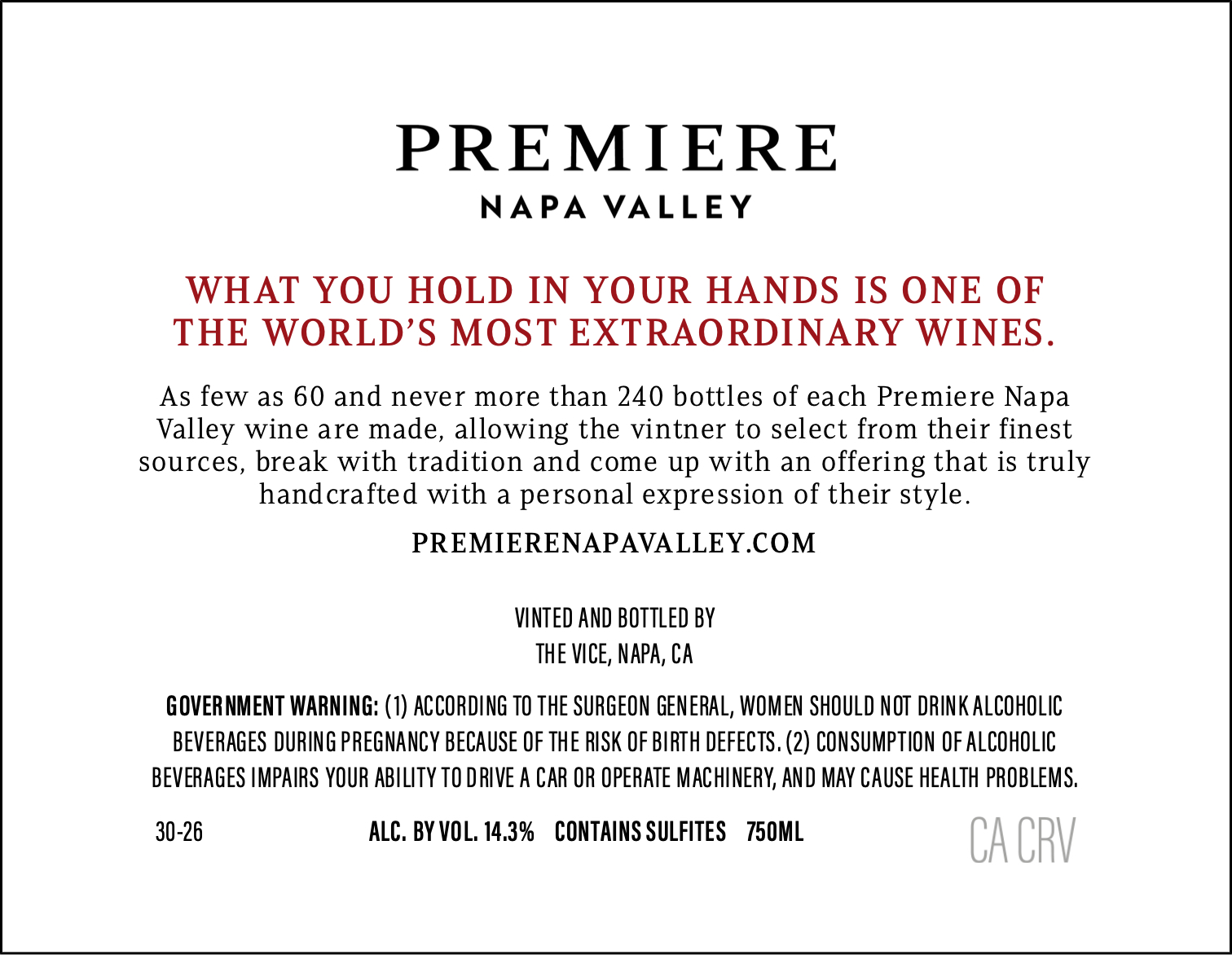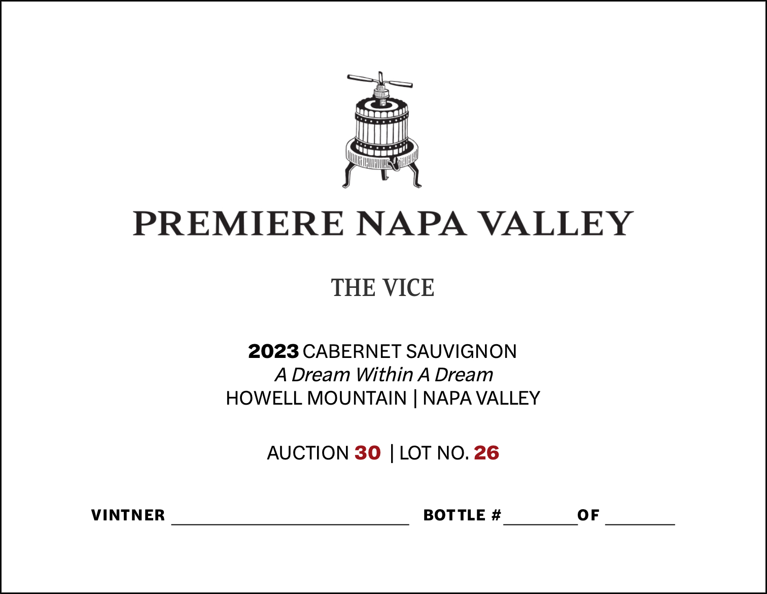 A limited-production Cabernet Sauvignon dessert wine from Howell Mountain, Napa Valley, crafted by The Vice Wines as part of the Premiere Napa Valley auction series. Produced in extremely limited quantities (60-240 bottles per release) with personal vintner expression.