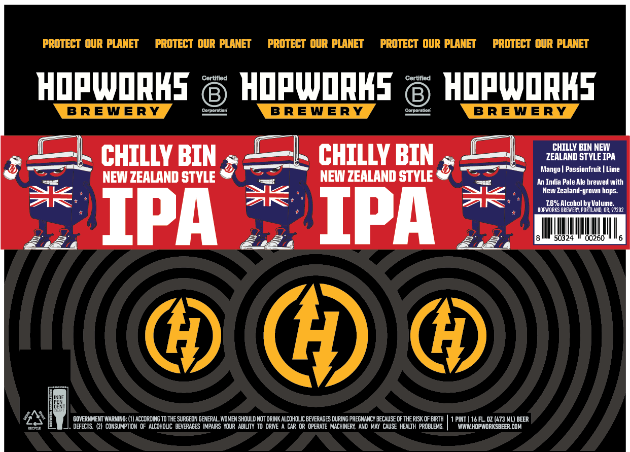 Chill Bin is a New Zealand-style IPA brewed with New Zealand-grown hops, featuring mango, passionfruit, and lime flavor notes.