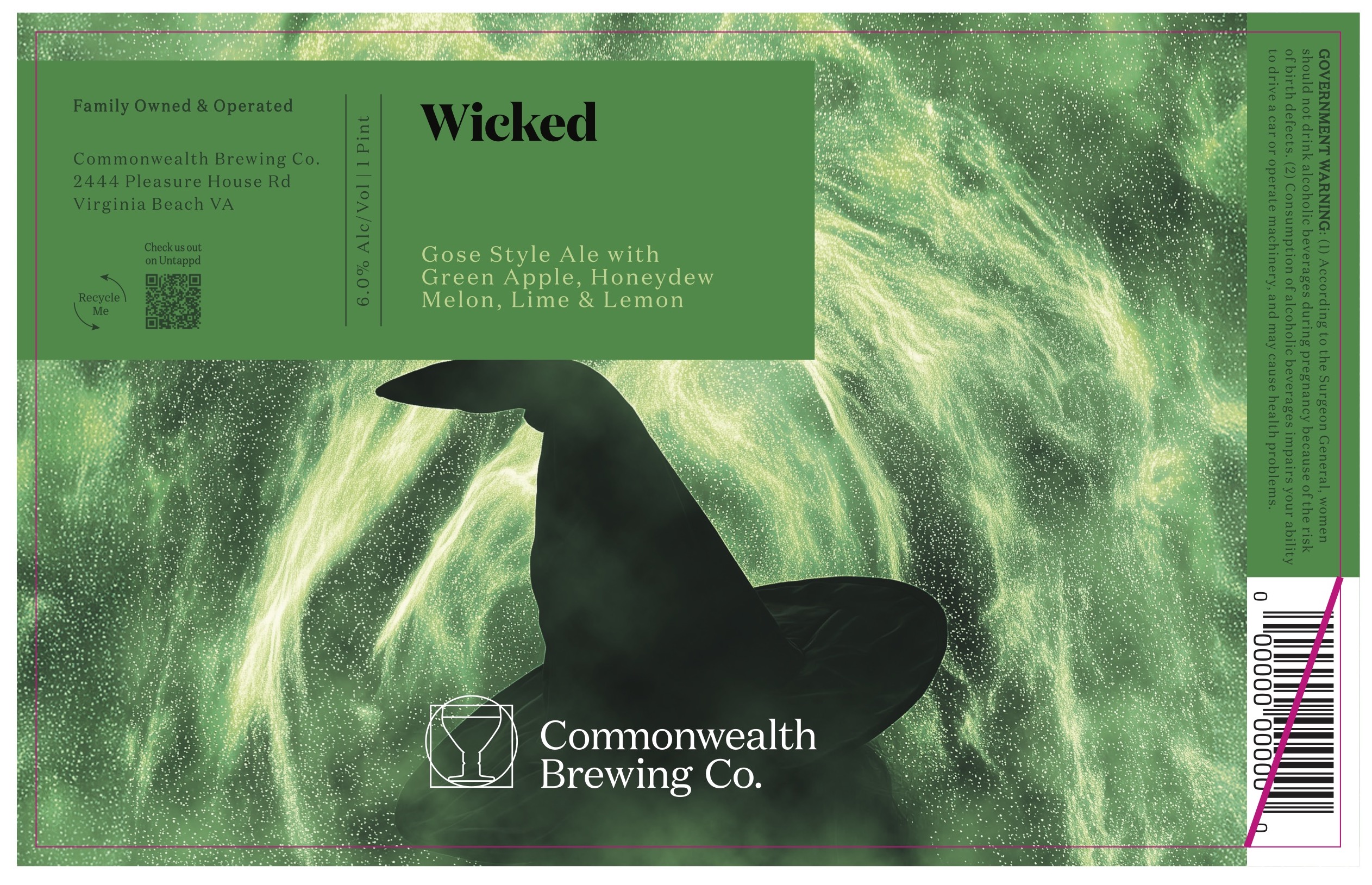 Wicked is a gose-style ale brewed by Commonwealth Brewing Co. featuring green apple, honeydew, melon, lime, and lemon flavors at 6.0% ABV.