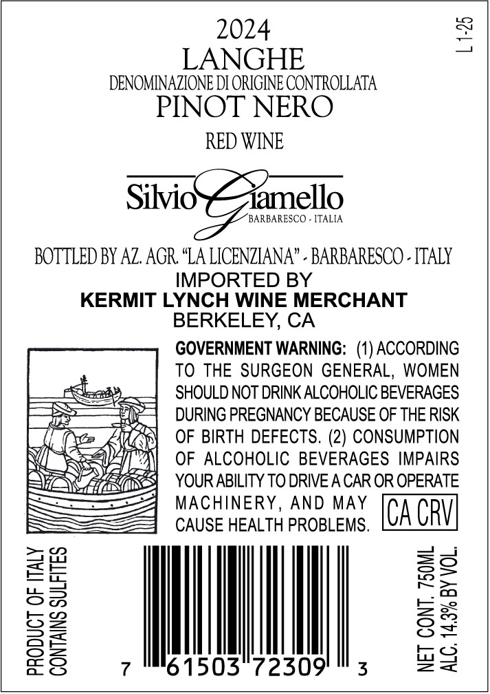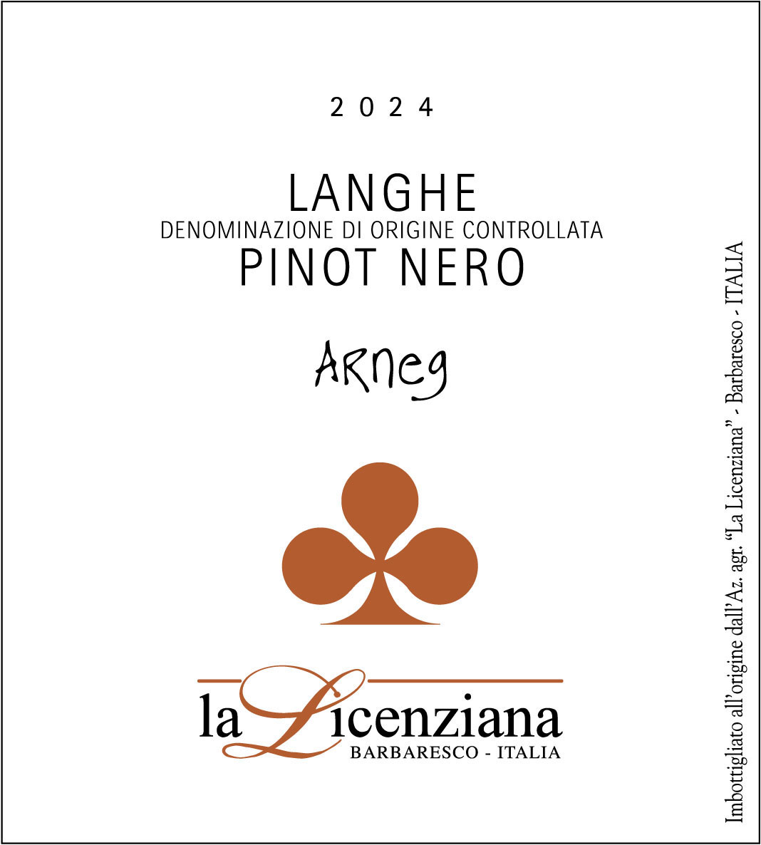 A 2024 Pinot Nero from Langhe, Italy, produced under Denominazione di Origine Controllata regulations and bottled by Az. Agr. La Licenziana in Barbaresco.