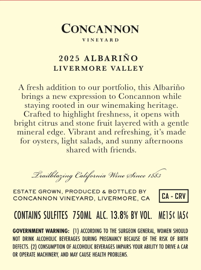 Tasting Notes (from label)“A fresh addition to our portfolio, this Albariño brings a new expression to Concannon while staying rooted in our winemaking heritage. Crafted to highlight freshness, it opens with bright citrus and stone fruit layered with a gentle mineral edge. Vibrant and refreshing, it's made for oysters, light salads, and sunny afternoons shared with friends.”
