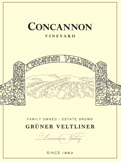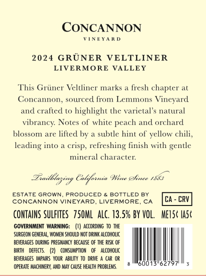 A 2024 estate-grown Grüner Veltliner from Concannon Vineyard in Livermore Valley, California, featuring notes of white peach and orchard blossom with a subtle hint of yellow chili and crisp, mineral finish.