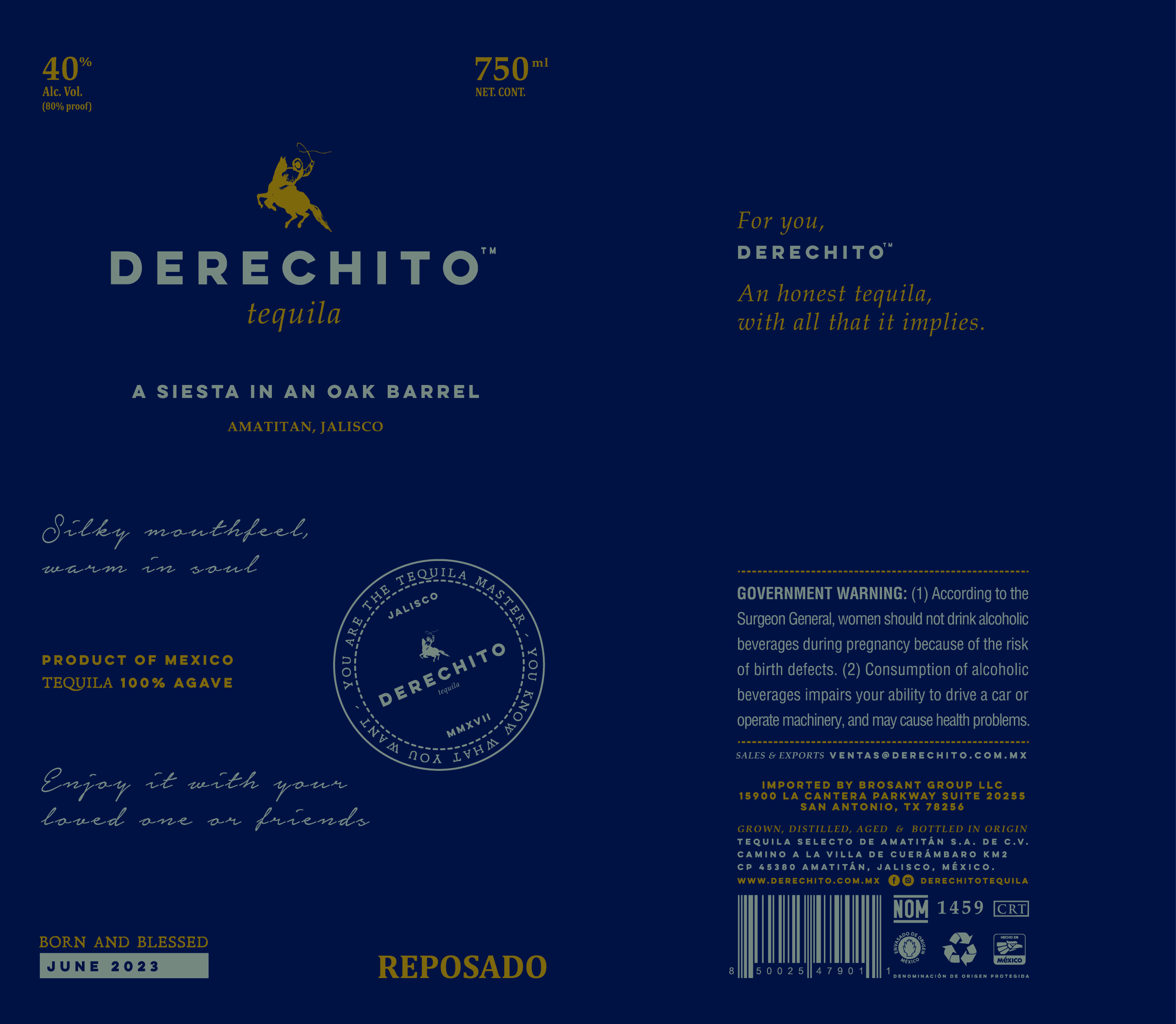Derechito Reposado is a 100% agave tequila aged in oak barrels, produced in Amatitán, Jalisco, Mexico. Described as an honest tequila with a silky mouthfeel and warm character.