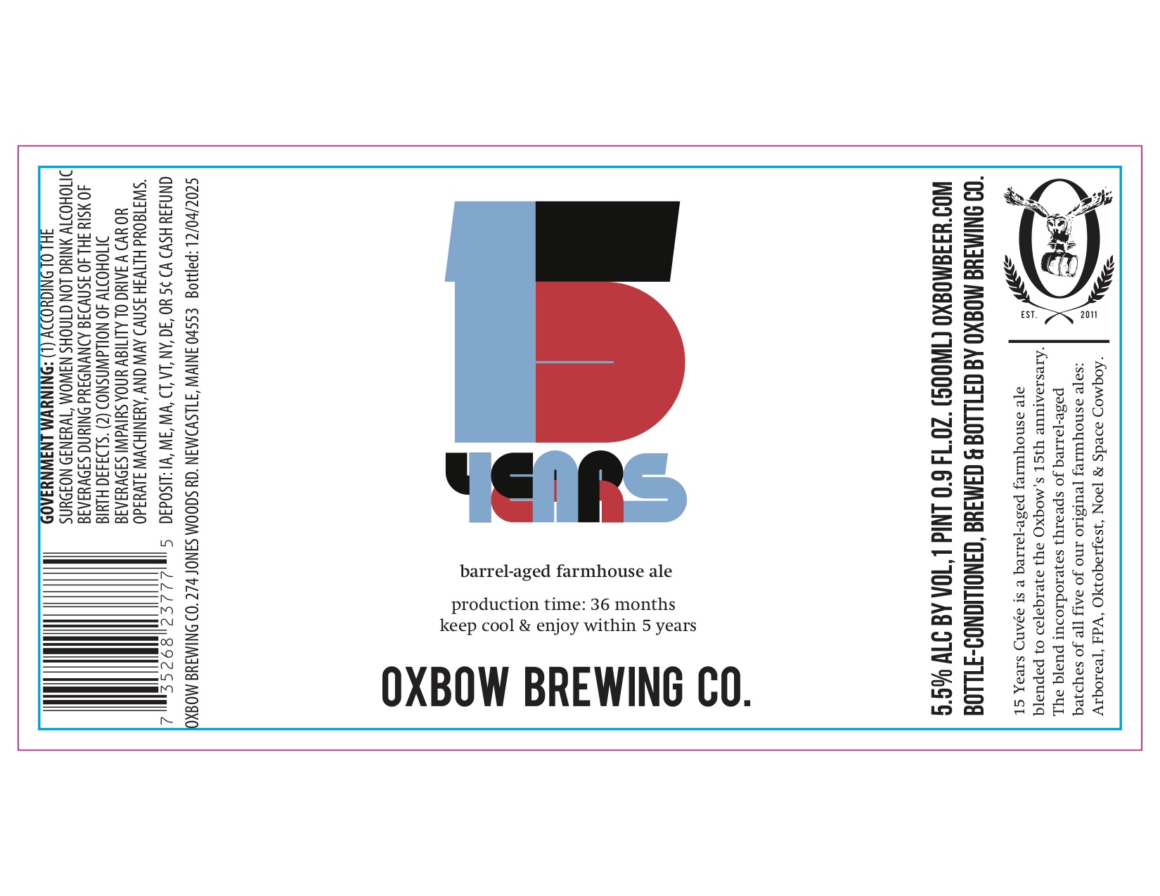 15 Years Cuvée is a barrel-aged farmhouse ale blended to celebrate Oxbow Brewing's 15th anniversary, incorporating threads of barrel-aged batches of all five original farmhouse ales: Arboreal, FPA, Oktoberfest, Noel & Space Cowboy.