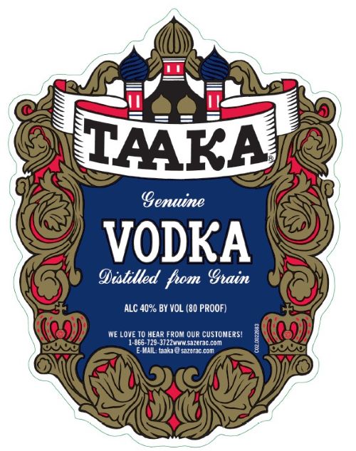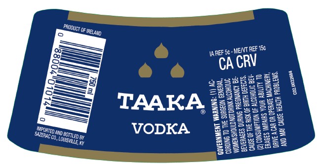 TAAKA Genuine Vodka is a grain-distilled vodka bottled at 80 proof (40% ABV), produced in Ireland and imported by Sazerac Co.